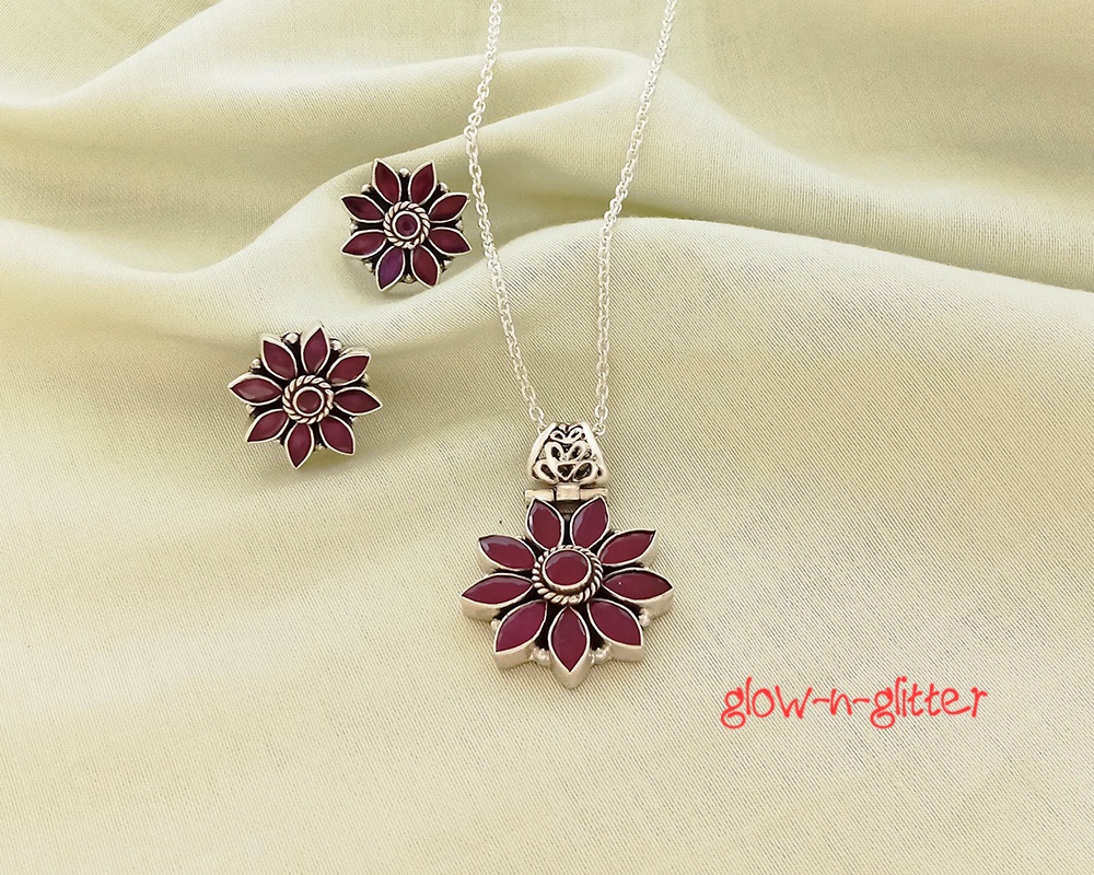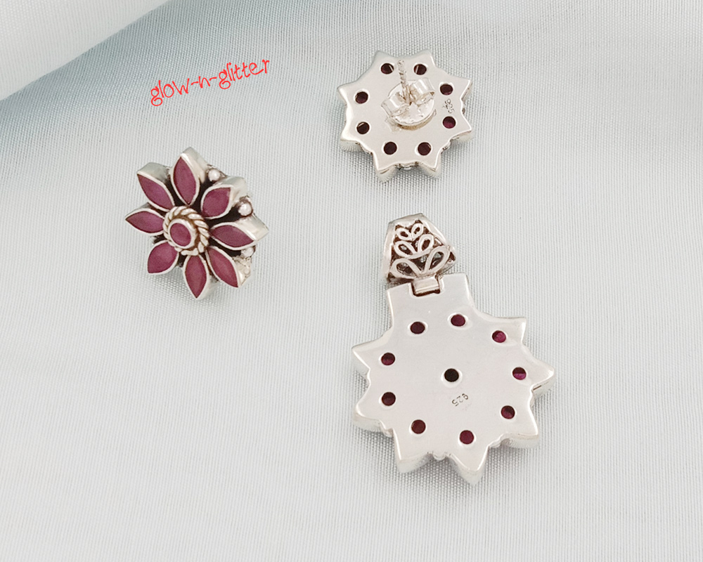 STERLING SILVER & RED ONYX FLORAL PENDANT EARRING SET