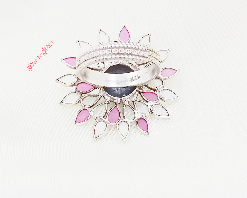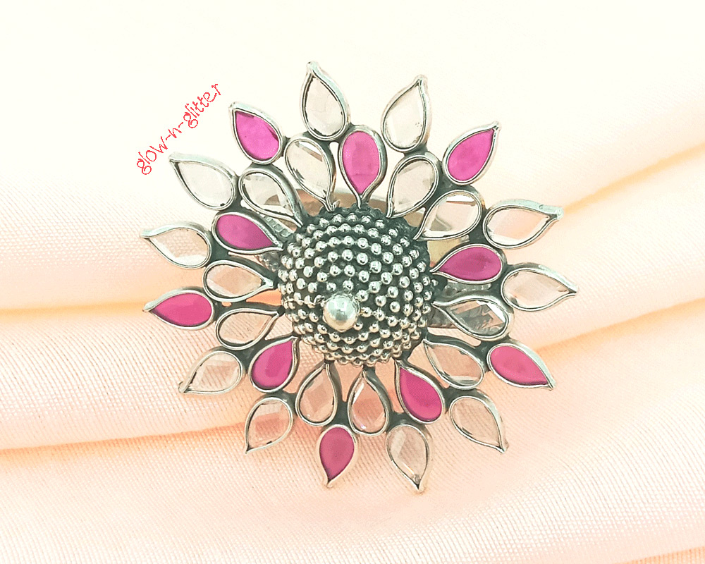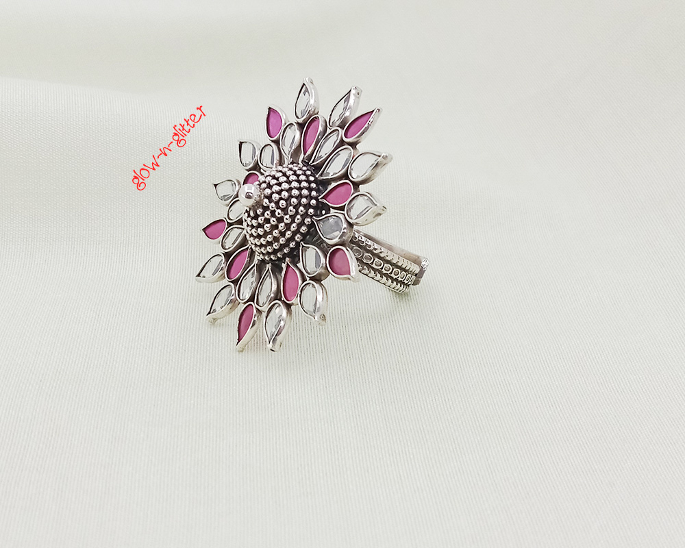 STERLING SILVER RED & WHITE FLOWER POLKI FINGER RING